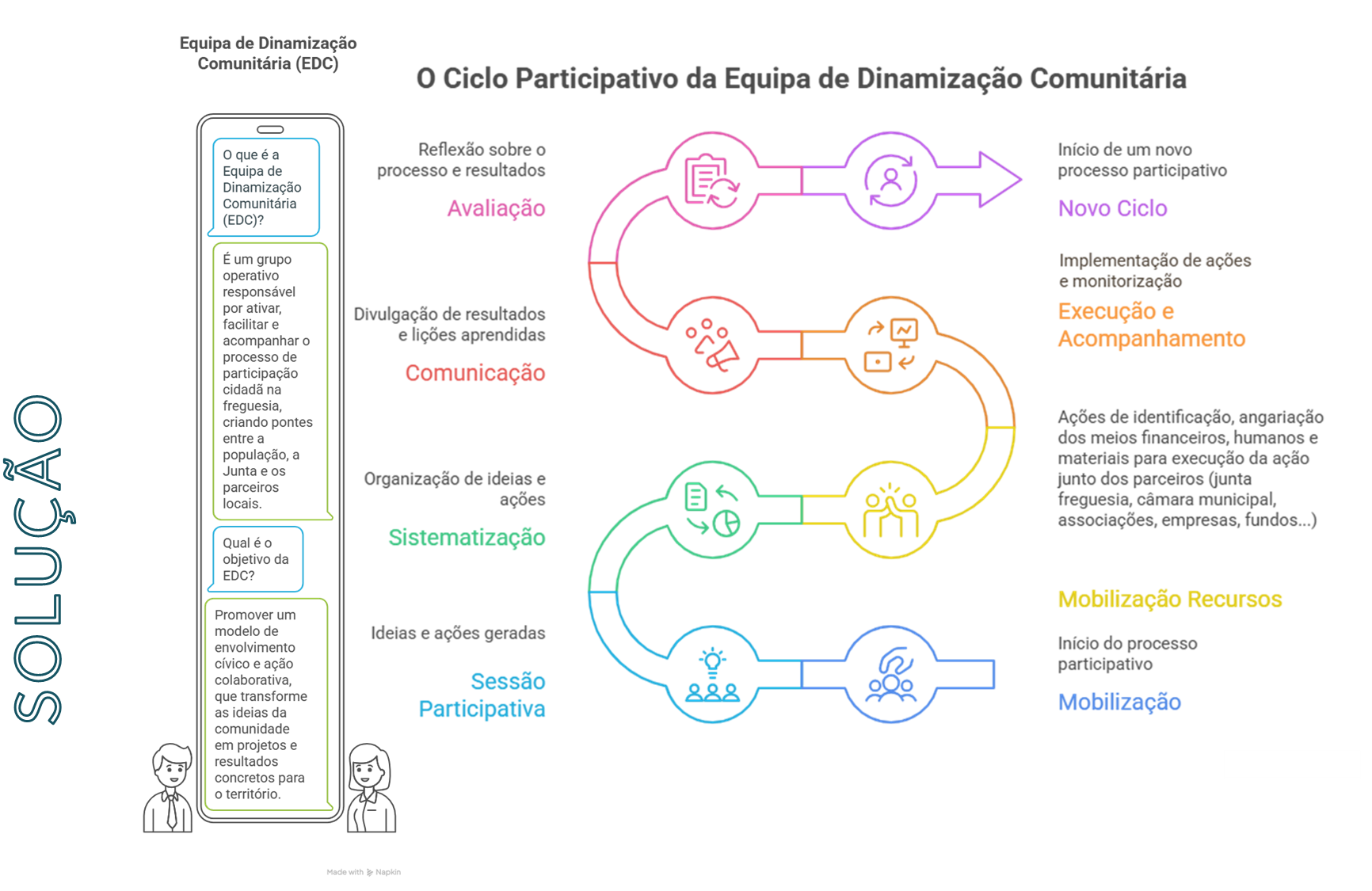 Junqueira Participa é um processo em construção, aberto e contínuo. A Equipa de Dinamização Comunitária (EDC) é o grupo operativo responsável por ativar, facilitar e acompanhar o processo de participação cidadã na freguesia, criando pontes entre a população, a Junta e os parceiros locais.